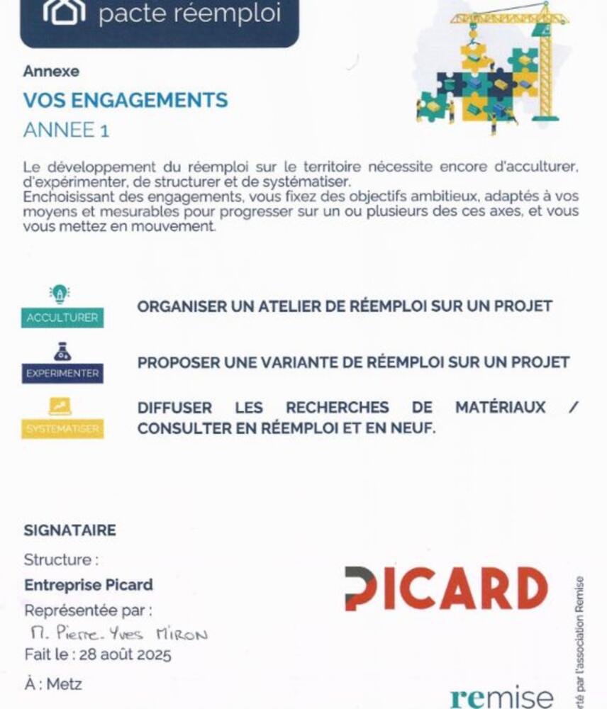 Toutes les actualitésPICARD a signé le « Pacte Réemploi des matériaux de construction dans la Région Grand Est » porté par l’association Remise. 👏